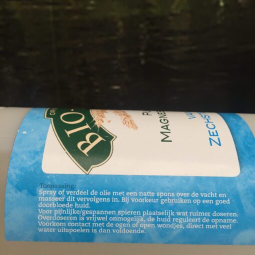 Dosering: de ervaring heeft geleerd dat een sportpaard van ruim 500 kilo, met intensieve training, goed reageert op een dagelijkse behandeling met 30 à 50 ml. olie. 1 keer sprayen is 1 ml. Hobbypaarden hebben genoeg aan een lagere dosering. Deze olie bevat 31% goed opneembare magnesiumchloride.