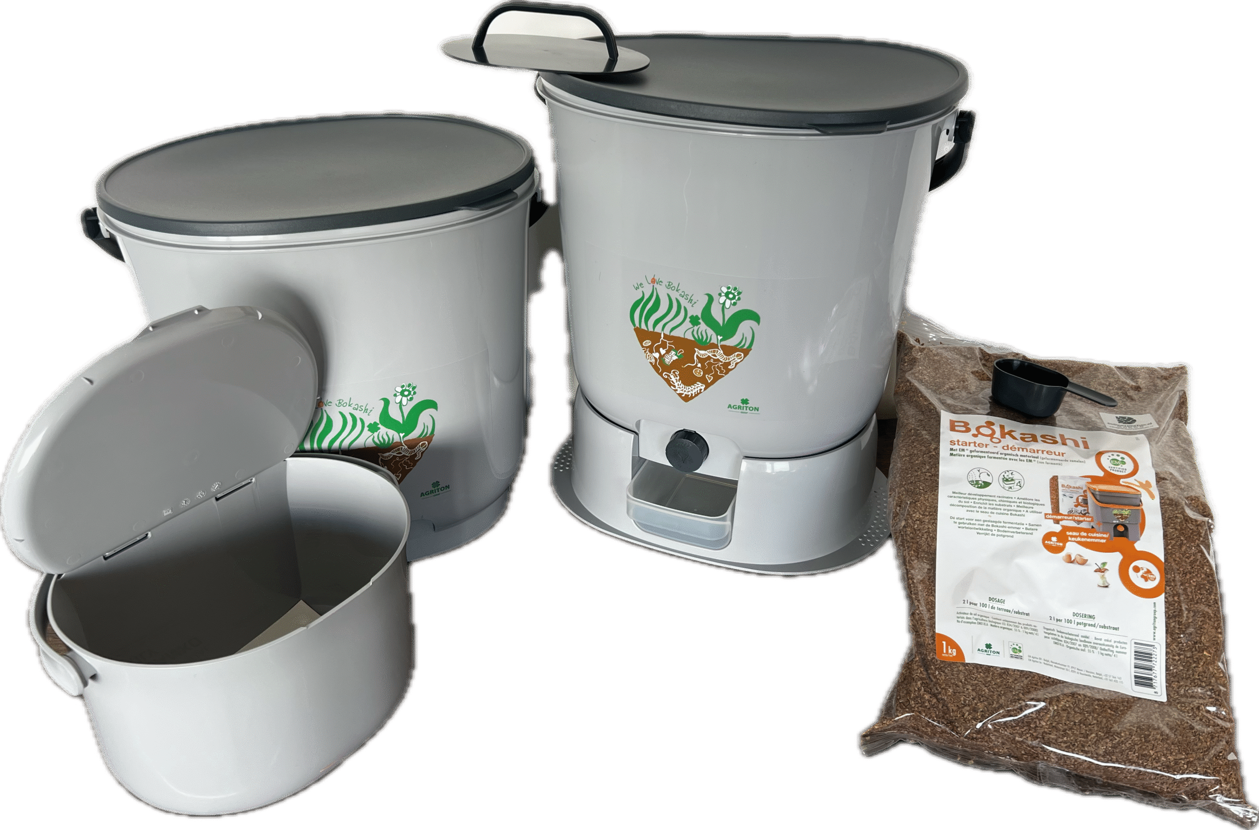 De set wordt geleverd met 2 kilo Bokashi starter van het bekende merk Agriton. Deze starter bevat de juiste mix van effectieve micro-organismen die nodig zijn voor het Bokashi-proces. Dankzij deze starter begint het fermentatieproces direct zodra je je afval in de emmer doet. Hierdoor wordt je afval snel omgezet in waardevolle compost.