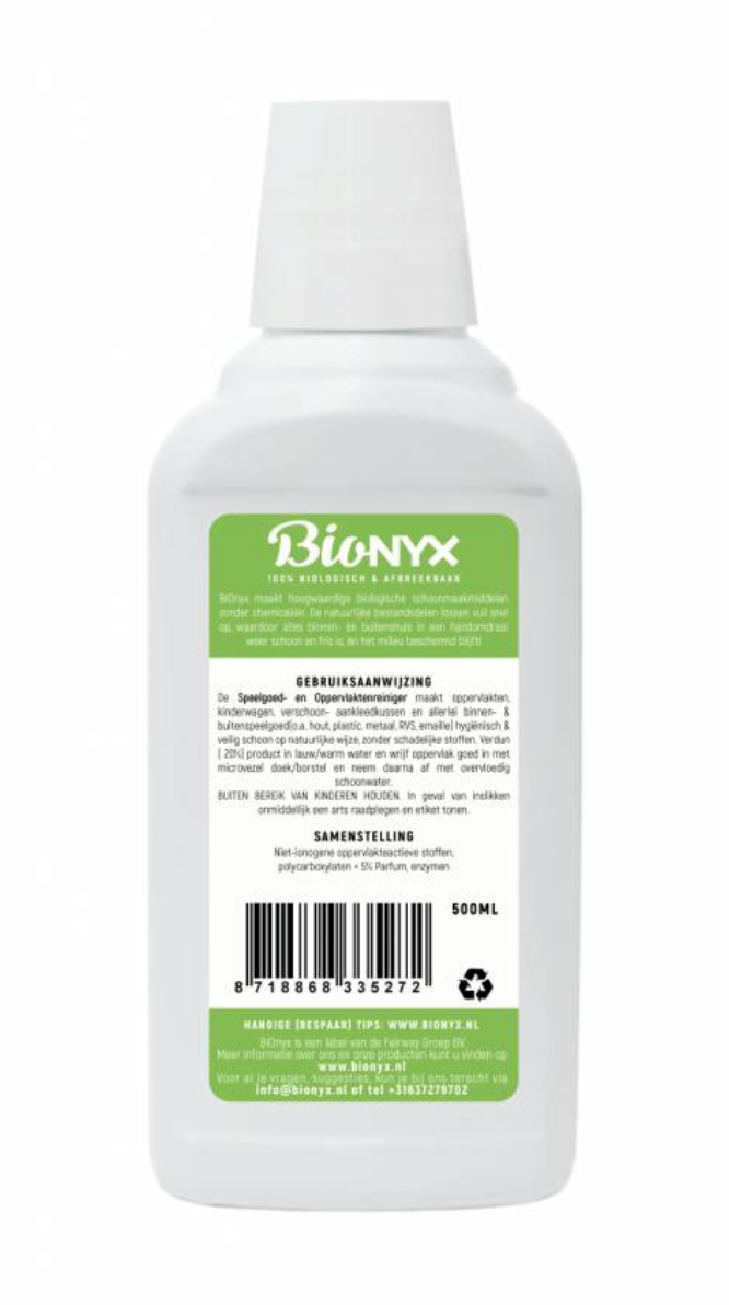 Speelgoed reiniger BIOnyx maakt veilig en hygiënisch schoon. BIOnyx speelgoed reiniger is geschikt voor alle speelgoed en oppervlakten. Maakt spelen met speelgoed gezond en veilig.