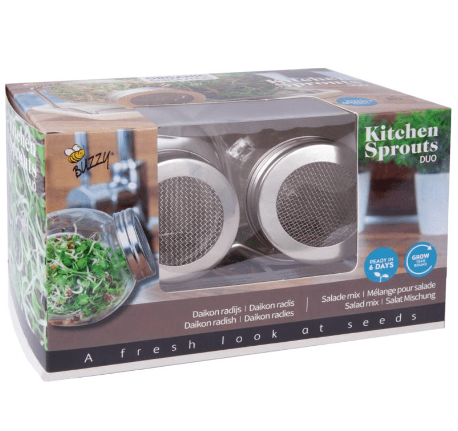 Eenvoudig spruitgroente kweken in een decoratieve glazen potten met RVS rooster.