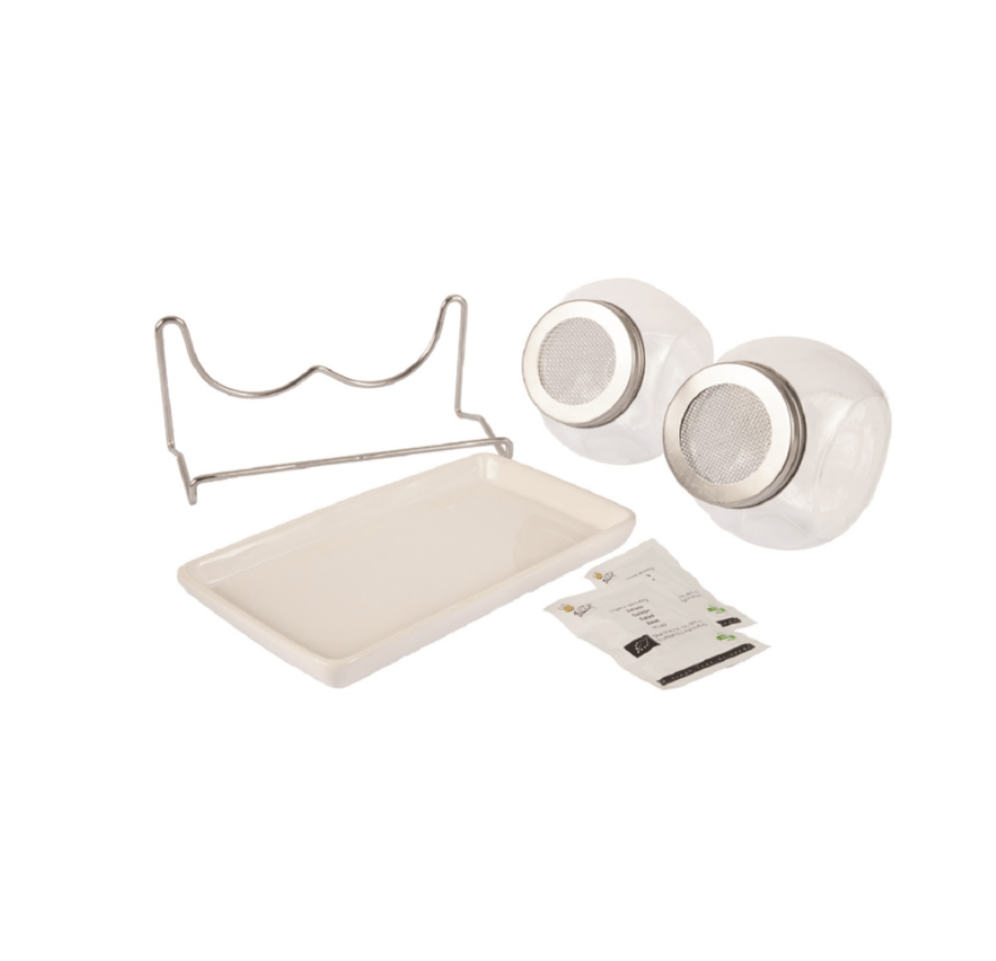 2 glazen potten met RVS deksel met gaas. 2 zakjes met zaden van Daikon Radijs en Salade mix. Een afdruiprek waarin de potten geplaatst kunnen worden. Dit alles staat op een mooie schotel. Ook is er een gebruiksaanwijzing ingesloten.