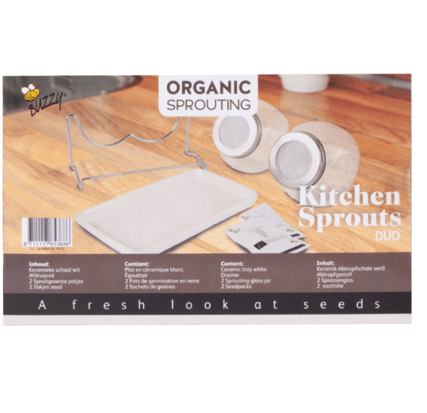 Deze Buzzy Organic Sprouting Duo pot met schaal BIO is een complete set kiemspruiten met glazen potten en opvang tray.