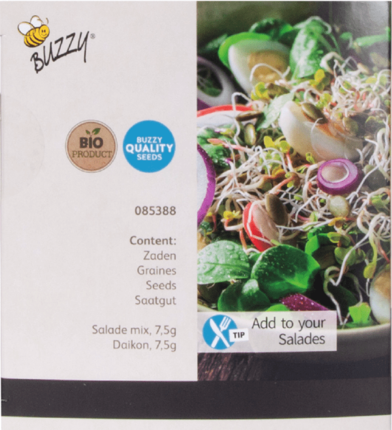 * 2 zakjes met biologische zaden van Spruitgroente, Salademix en Daikon bijgeleverd.