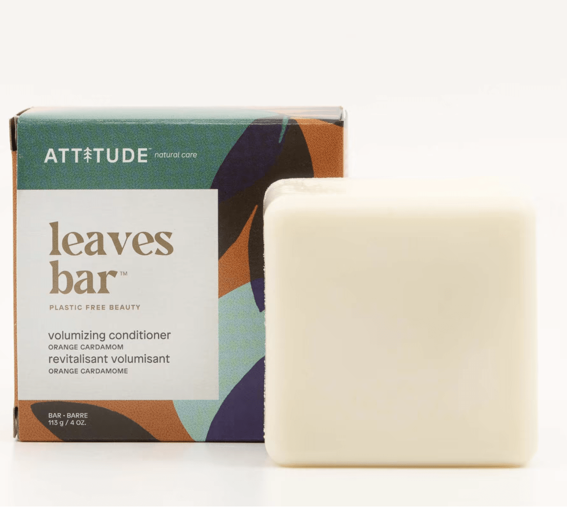 Attitude Volume Conditioner Orange/Kardemon in een handig blok en verpakt in een FSC kartonnen, plasticvrij doosje. Afmeting 7,9/7,9/3,5 cm. met een gewicht van 113 gram.
