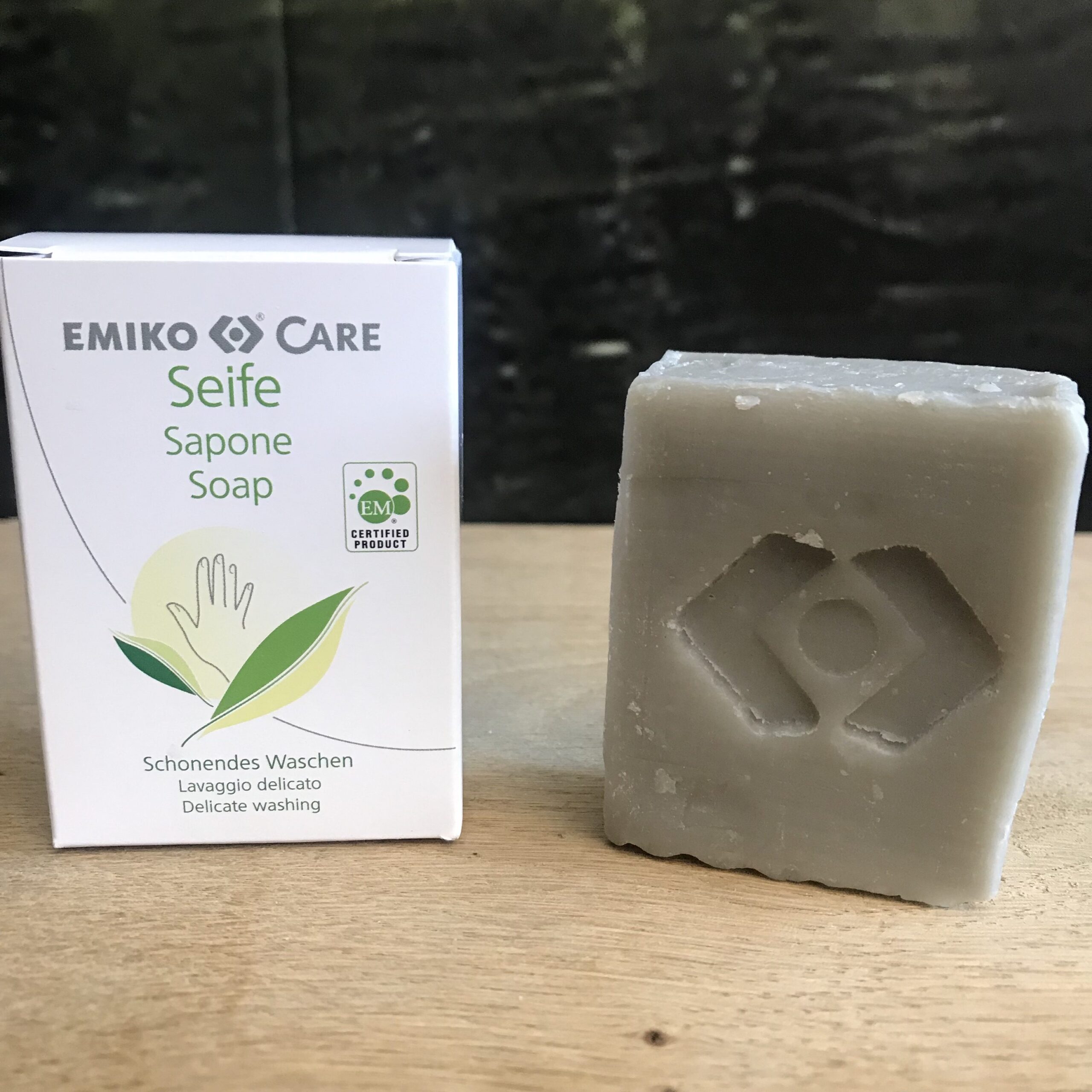EMiko Care zeep, 60 g Een combinatie van het beste Rügen healing krijt, kostbare oliën, EM-X Gold® en EM-X® keramiek poeder. De verzorgende zeep zorgt voor een zachte reiniging en rustgevende verzorging. Laat de zeep na gebruik in een geschikt zeepbakje drogen.