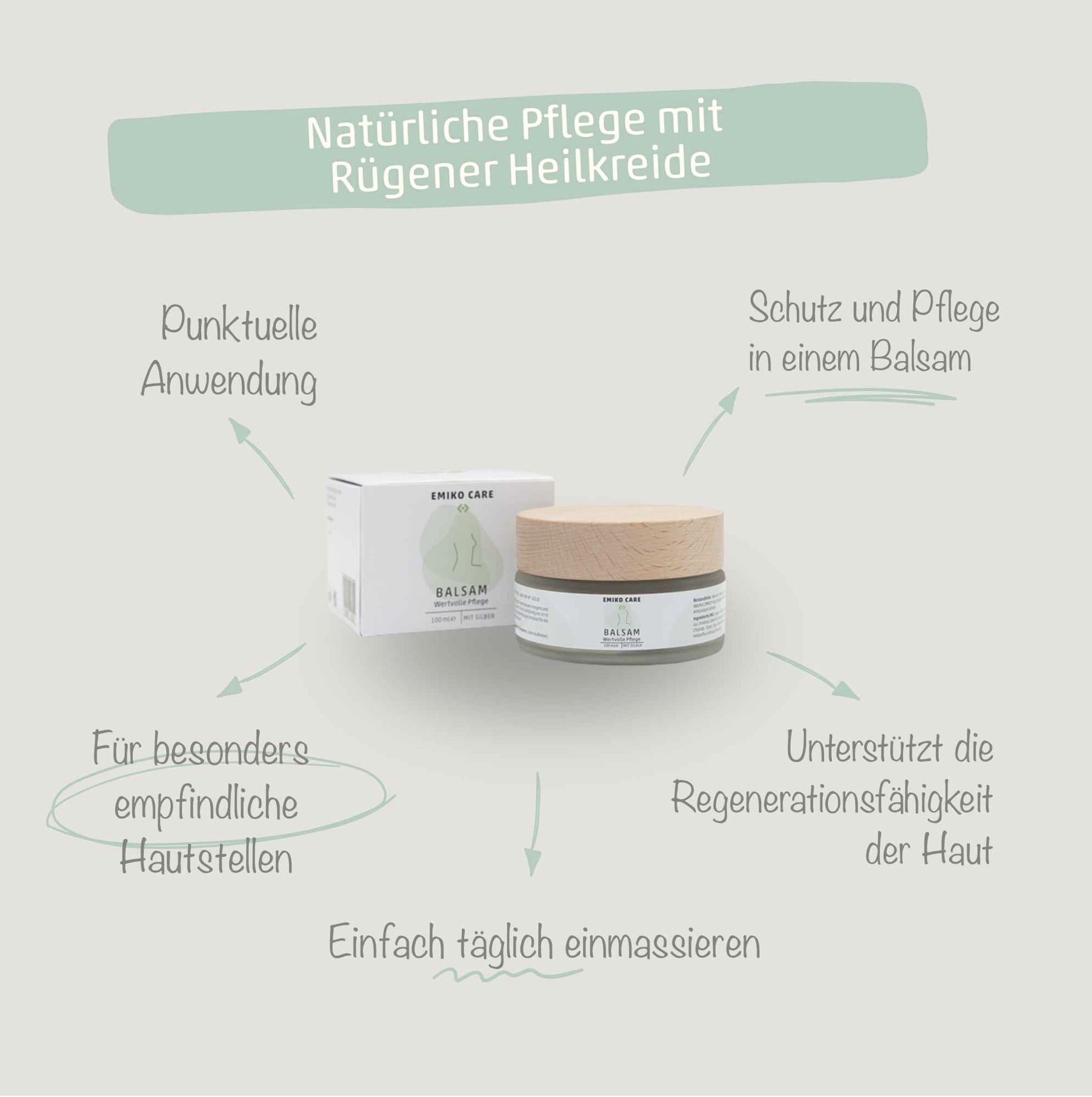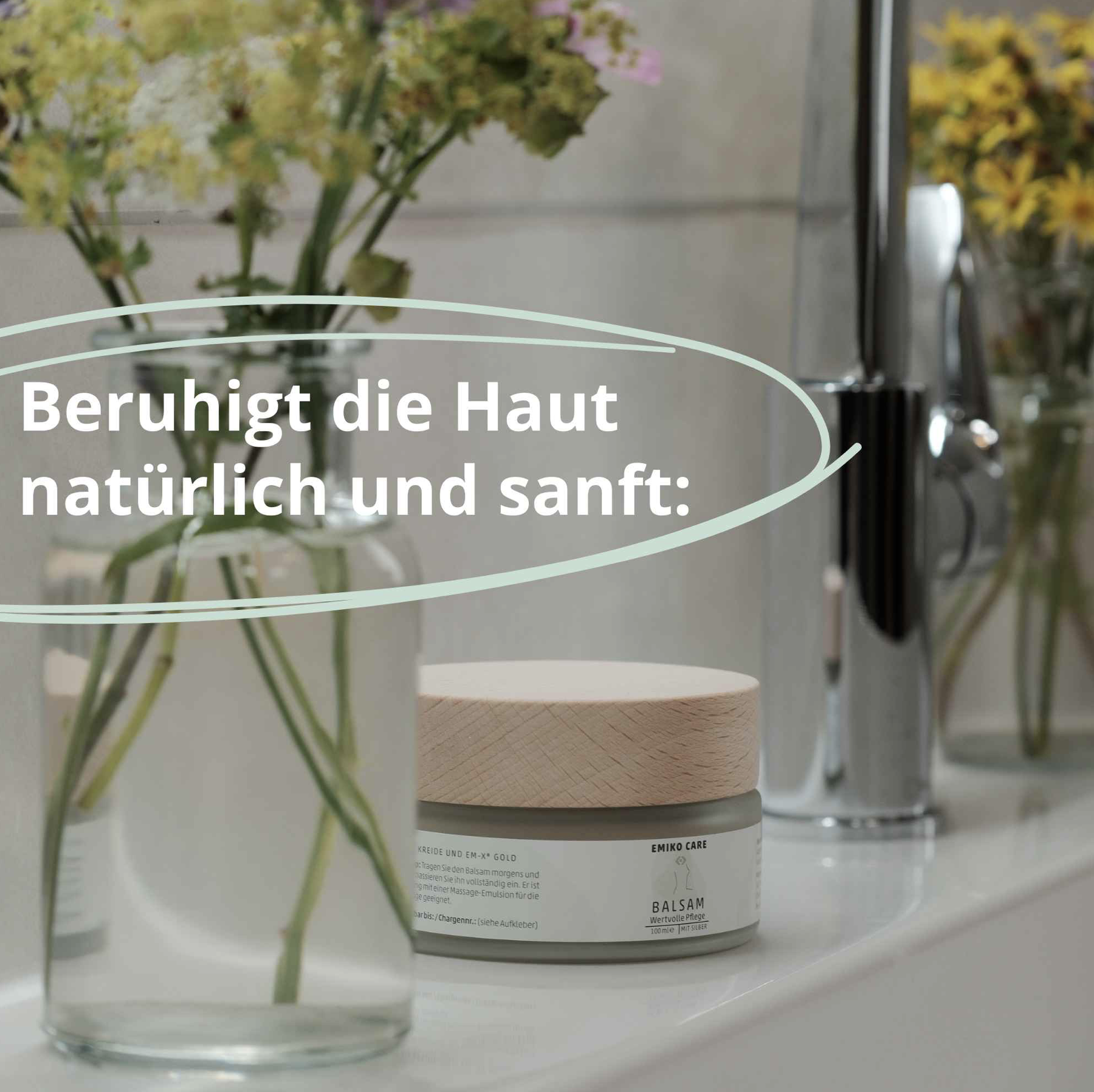 EMiko Balsem Natuurlijke Huidverzorging | Voor Droge & Gevoelige Huid bevat belangrijke mineralen en sporenelementen. Het ondersteunt het regeneratievermogen van je huid. Die voelt merkbaar gezonder, zachter en gladder aan. De huidstructuur wordt verbeterd en de lichaamsbalans komt in orde. Het zorgt voor een soepele en gezonde huid.