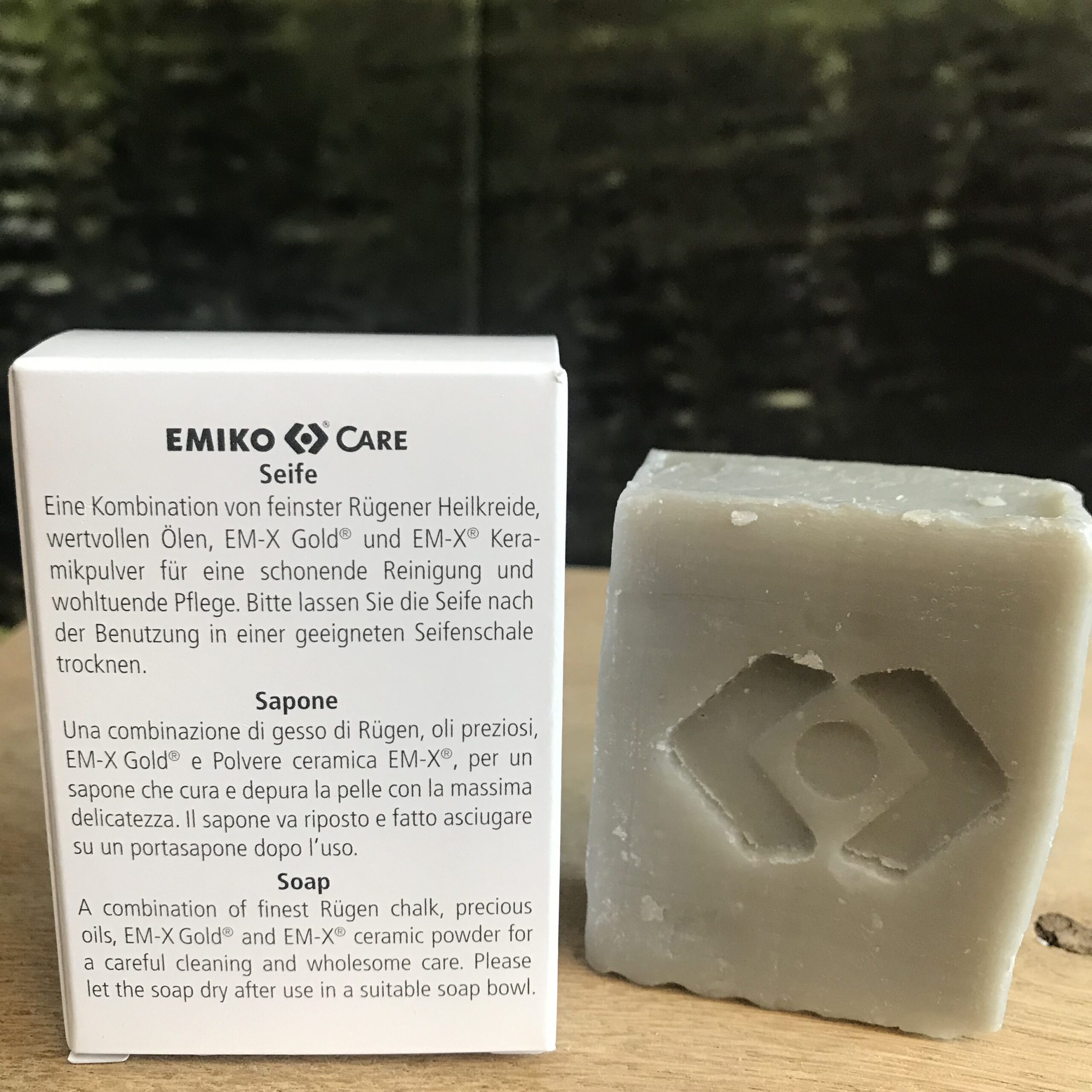 EMiko Care zeep, 60 g. Een combinatie van het beste Rügen healing krijt, kostbare oliën, EM-X Gold® en EM-X® keramiek poeder. De verzorgende zeep zorgt voor een zachte reiniging en rustgevende verzorging. Laat de zeep na gebruik in een geschikt zeepbakje drogen.