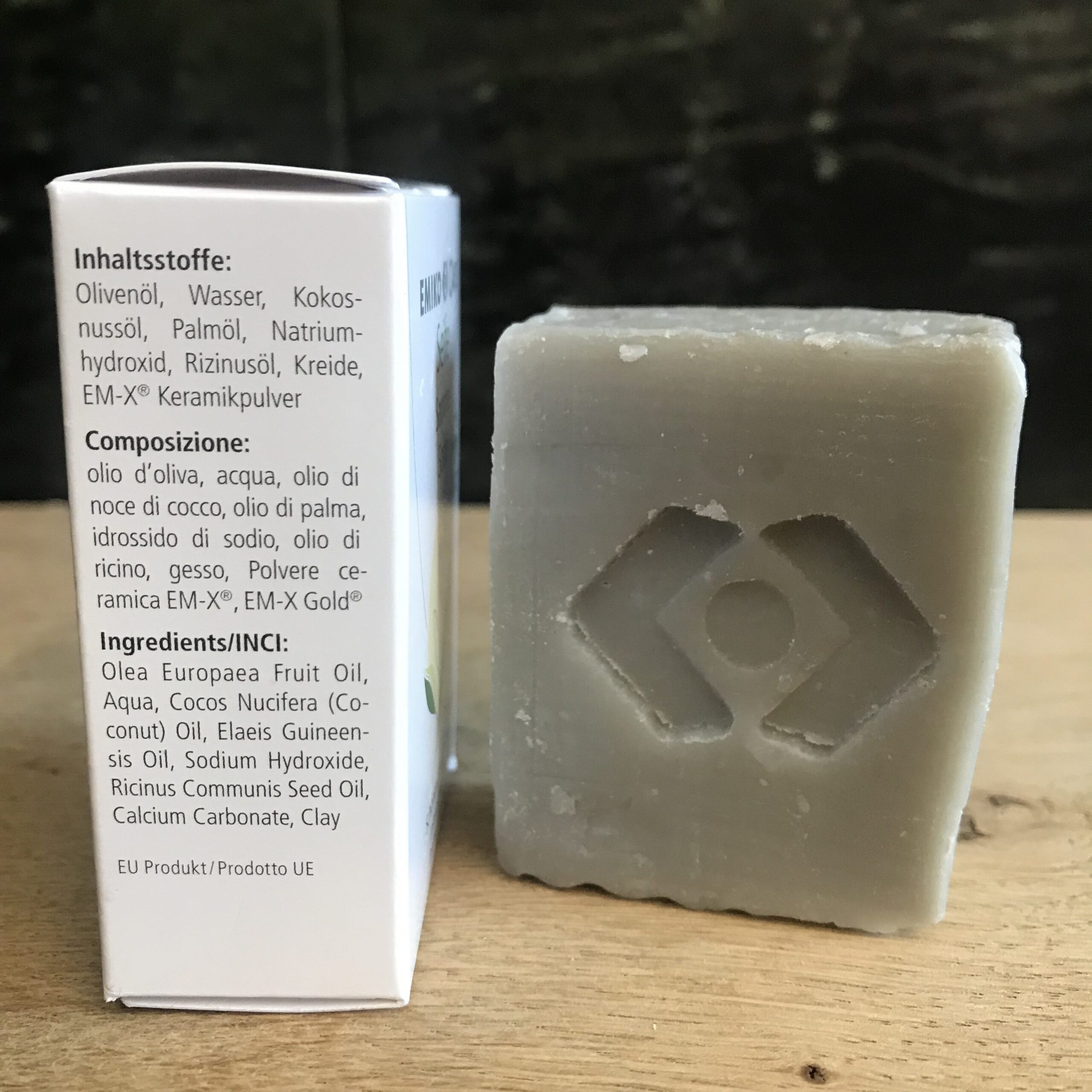 In deze zeep zit onder andere Olijfolie, water en kokosnotenolie. Ook is er palmolie, krijt en EM-X keramiekpoeder aan toegevoegd. Daarnaast ricinusplant olie en klei. Dit alles tezamen maakt deze verzorgende zeep zeer uniek en erg waardevol voor uw huid.