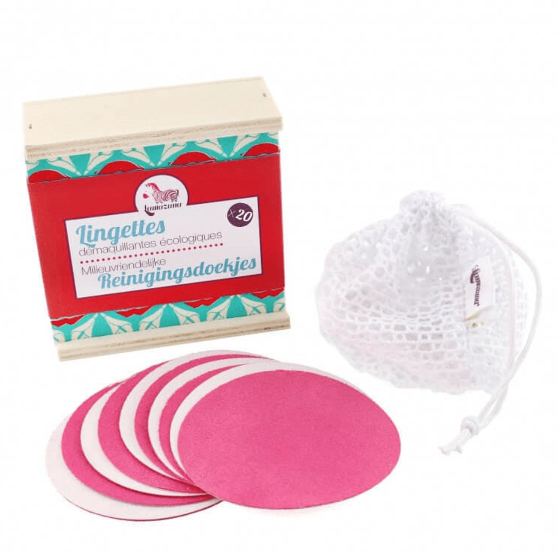 Lamazuna 20 Reinigingsdoekjes Wasbaar is een box met 20 roze wasbare make-up doekjes.
