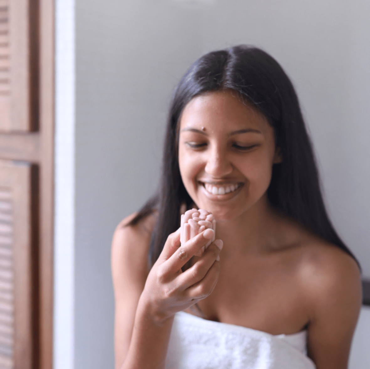 Voor de roze cacaoboter raden we aan om deze eerst in je handen te wrijven om deze te laten smelten en een betere applicatie op je haar te krijgen.
