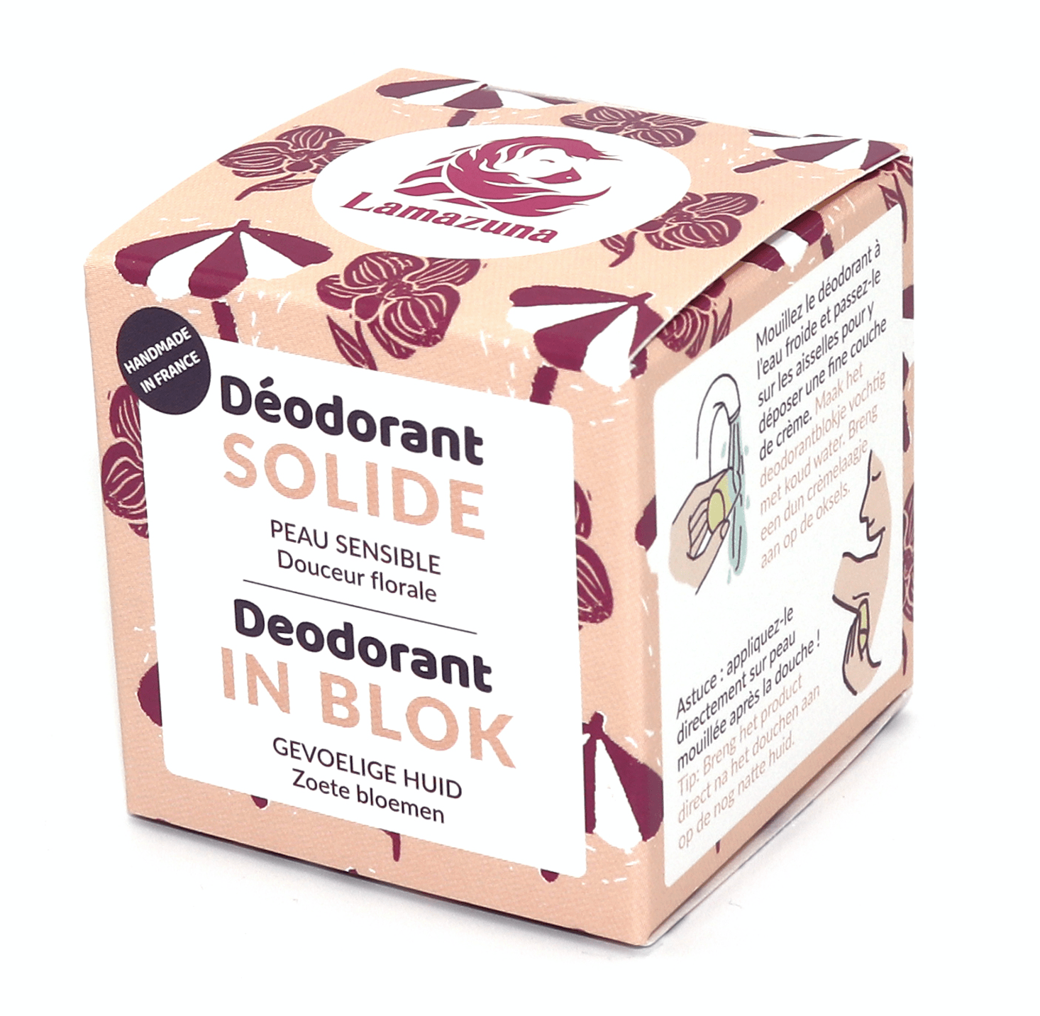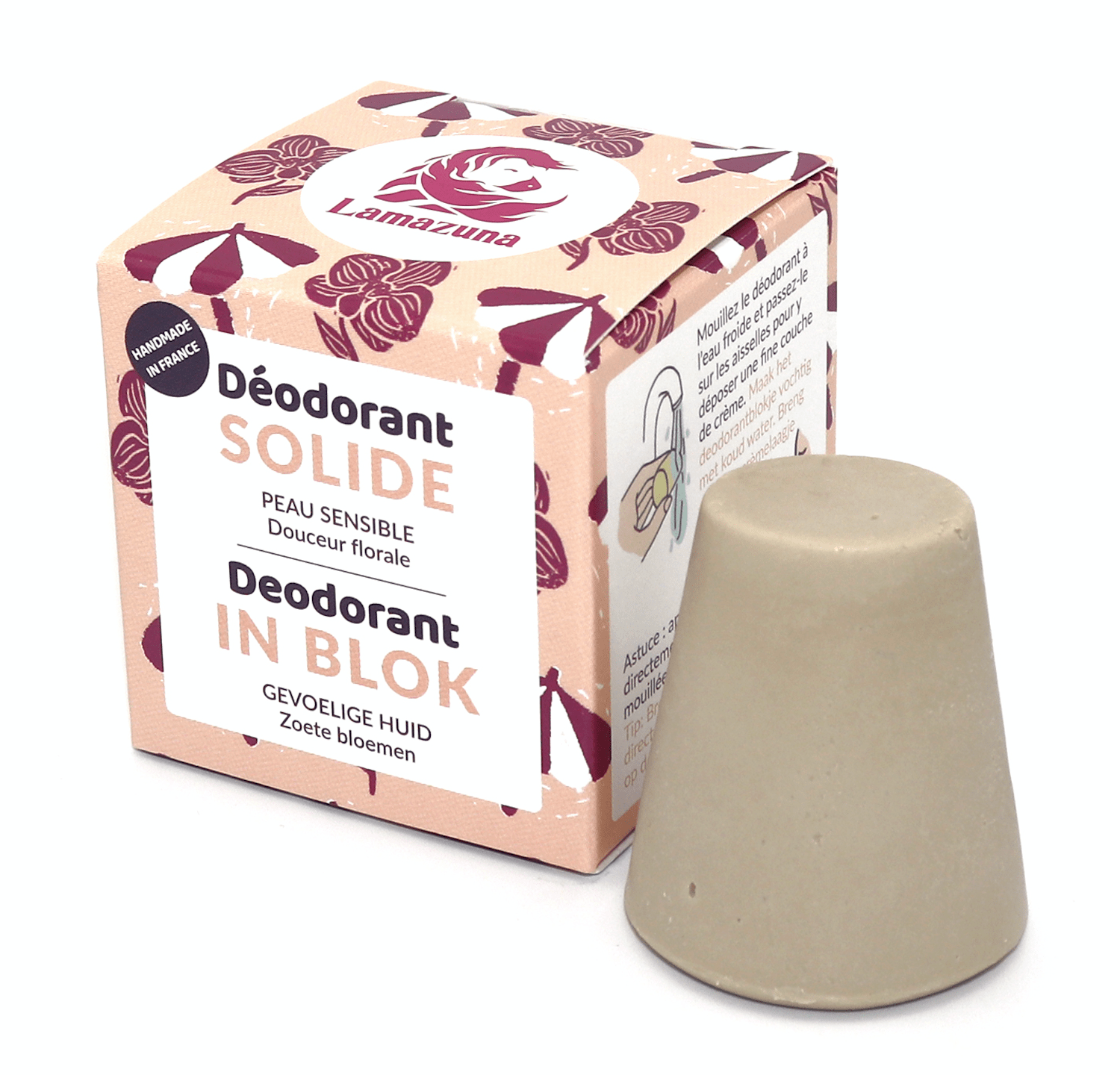 Deze Lamazuna Deodorant Gevoelige huid Bloemen is een 100% natuurlijke Deodorant Zeepblok, voor de gevoelige huid, met zoete bloemen. Vrij van essentiële oliën en aluminiumzouten (AZH). COSMOS Organic gecertificeerd. Inhoud 30 ml,