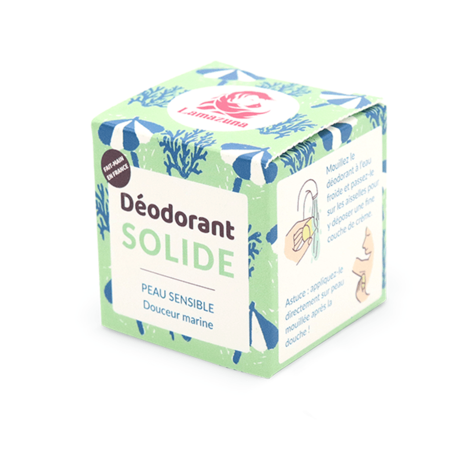 Maar deze deodorant in blokvorm is vooral op de gevoelige huid bewerkt en getest om het beste bij de huid te passen. De Lamazuna Deodorant Gevoelige Huid Zilte Zee wel. GEEN bicarbonaat en essentiële oliën, we wilden deze vaste deodorant liever verrijken met zinkricinoleaat vanwege zijn deodoriserende kracht en met diatomeeënaarde vanwege zijn absorptievermogen. Met zijn romigere textuur en zijn 41,8% biologische ingrediënten zullen je kwetsbare oksels er dol op zijn!