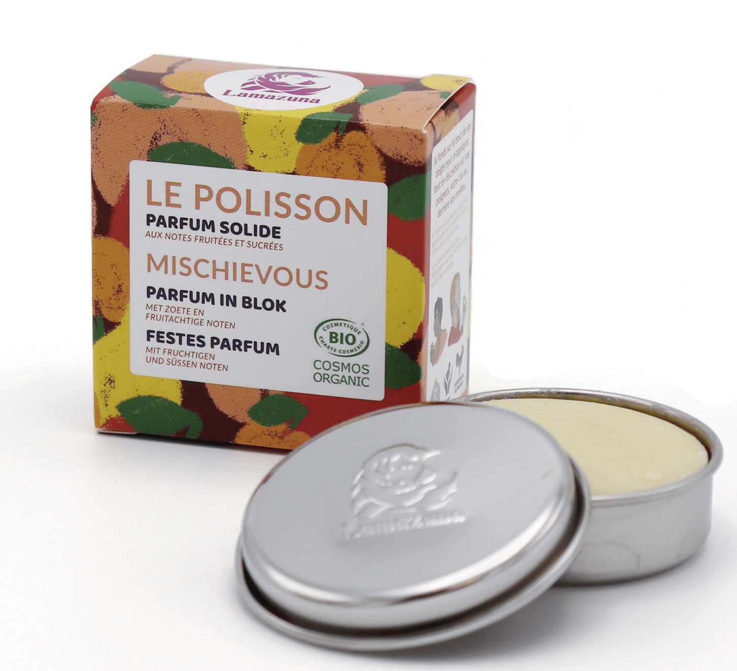 Lamazuna 100% natuurlijke parfum in blok, Mischievous, in roestvrij stalen tinnen bewaardoos, COSMOS Organic gecertificeerd