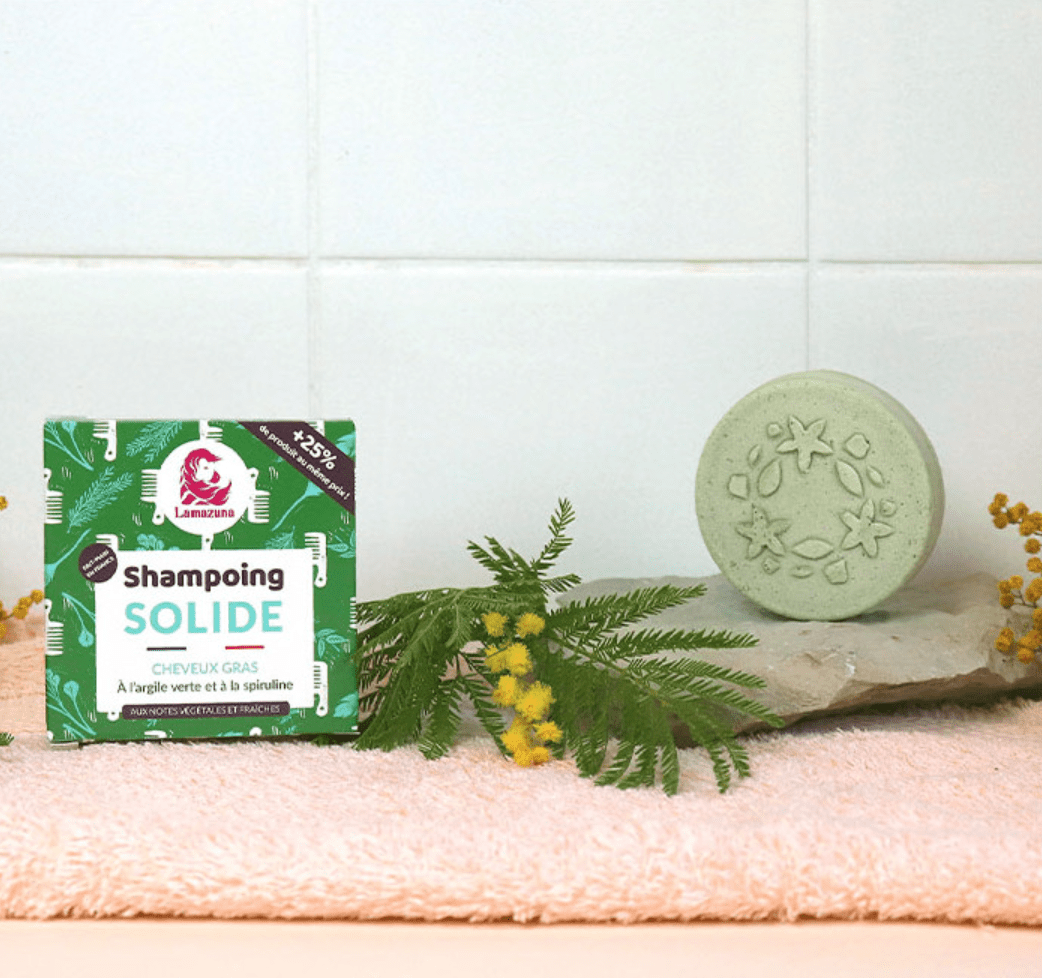 Onze vaste shampoo voor vettig haar in tabletformaat, groter en vergemakkelijkt het aanbrengen. Het nieuwe duo met oppervlakteactieve stoffen geeft het een royaler schuim! Haar parfum? Een 100% Frans duo van groene klei en spirulina voor een echt moment van frisheid onder de douche.