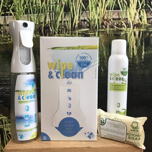 Wipe & Clean schuimt niet en ruikt niet zoals u gewend bent, maar het doet gewoon zijn werk. U kunt alle schoonmaakmiddelen uit uw keukenkastje vervangen door dit EM Schoonmaakpakket. Schoonmaken met bacteriën, wie wil dat nu niet?