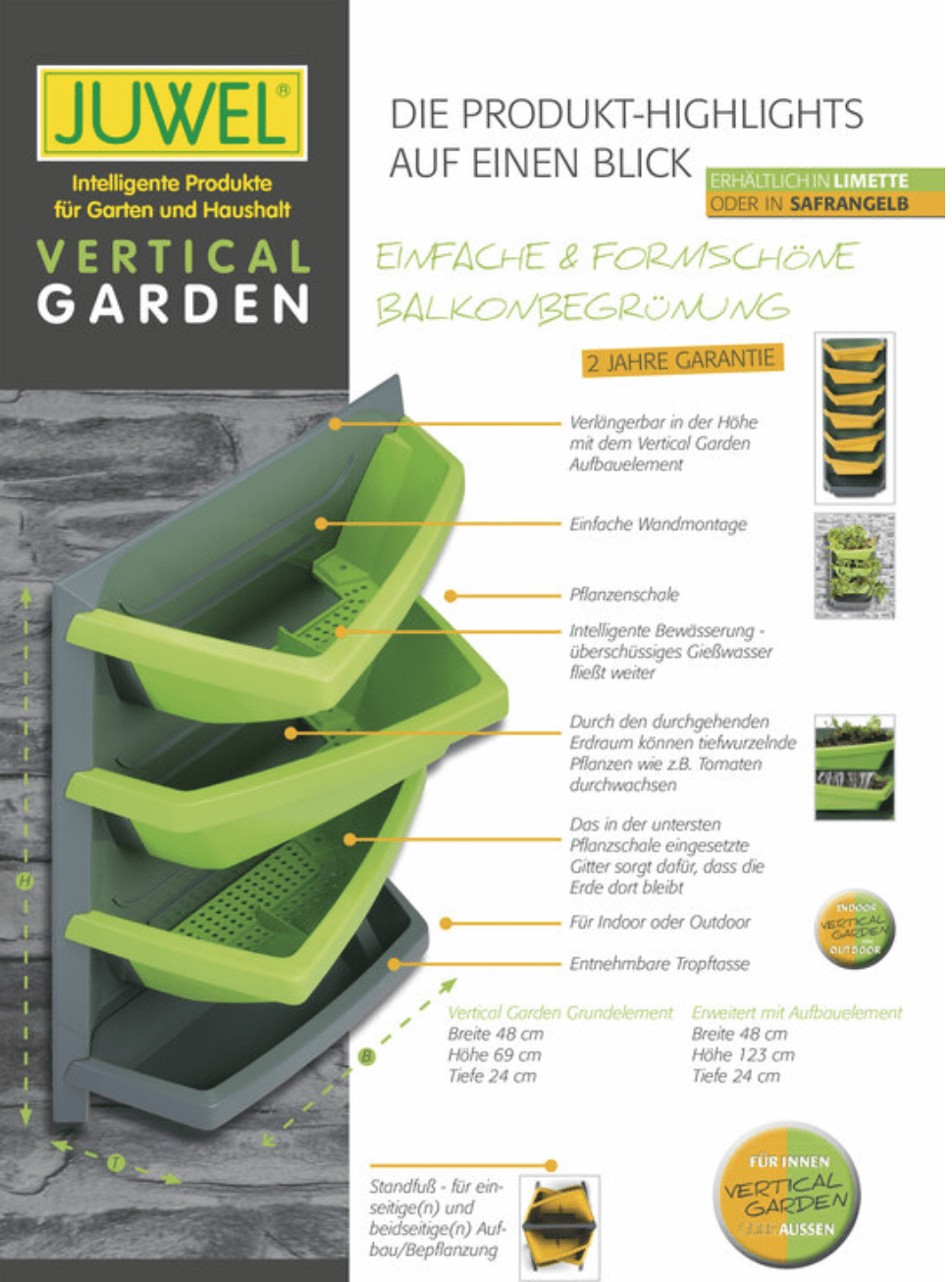 Vertical Garden van JUWEL is een nieuw, flexibel en zeer functioneel systeem voor het planten van balkons en terrassen. De “verticale tuin” is snel en eenvoudig op te zetten en maakt de onmiddellijke teelt van verse kruiden, sla, knapperige cocktailtomaatjes, geurige bloemen of verleidelijke aardbeien mogelijk. Begin met de verticale tuin standaard.