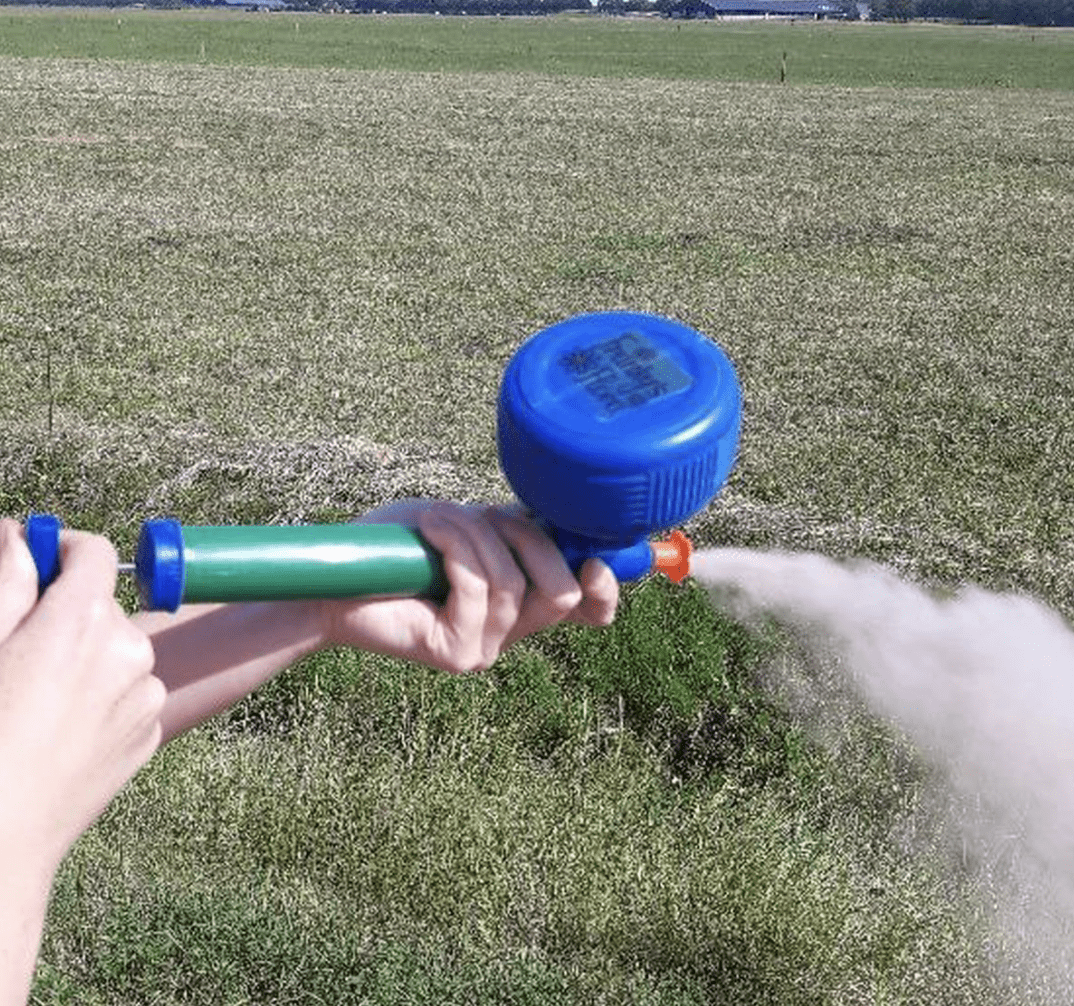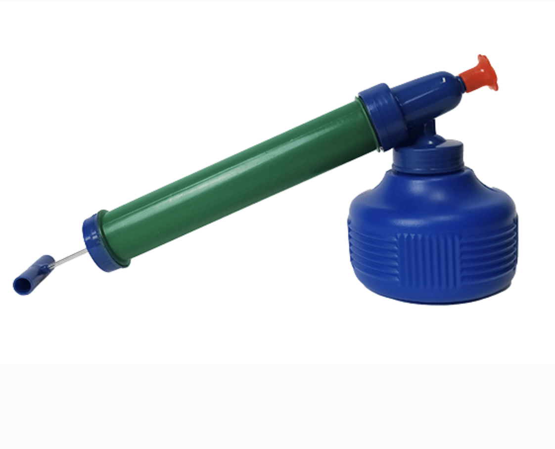 Vul het reservoir met lavameel. Zorg ervoor dat je het reservoir maximaal voor 75% vult. Tijdens het spuiten moet je de spuitmond omhoog gericht houden. Hierna begin je met pompen, waardoor de lavameel uit de spuitmond komt en zich verspreid over de planten. Spuit altijd met de wind mee en indien gewenst: gebruik een mondkapje.