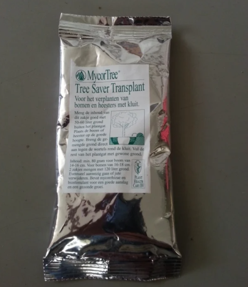 Mycorrhiza TreeSaver Transplant 85 gram voor toevoeging in het plantgat. Een zakje is voldoende voor een boom van 12-14 cm. Voor bomen van 16-18-20 cm. zijn 2 zakjes Tree Saver® Transplant nodig. Voor grotere bomen is de plantgat grootte van belang. Maximaal 4 zakjes per boom.