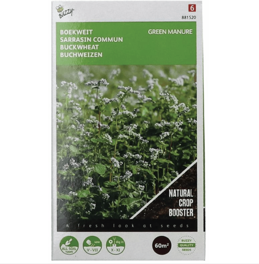 Groenbemester Boekweit bloeit met helderwitte bloemen waar veel bijen en vlinders op af komen. Boekweit is een uitstekende, snelgroeiende groenbemester omdat het stikstof bindt in de grond. Na de oogst van een gewas wordt daarom boekweit gezaaid om de grond bezet te houden. Aan het einde van het seizoen wordt boekweit ondergespit en brengt het organische stof in de grond. U kunt ook het afgestorven materiaal als mulchlaag gebruiken. Zowel de planten als de zaden zijn niet winterhard.