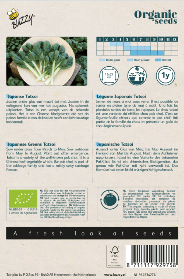 Zaaien onder glas van maart tot mei of zaaien in de volle grond. Da kan van mei tot en met augustus. Na opkomst uitplanten. Japanse Tatsoi Bio is een variant van de bekende paksoi. Het is een Chinese bladgroente die net als paksoi familie is van de kool en heeft een licht kruidige koolsmaak. De hoogte van het plantje is ongeveer 20 cm. Je kunt al oogsten vanaf april tot en met september.