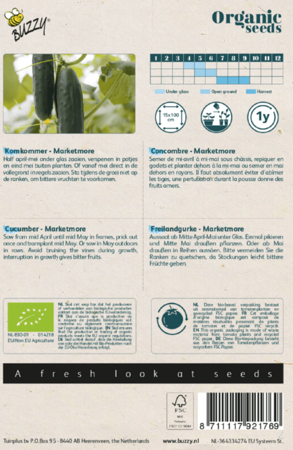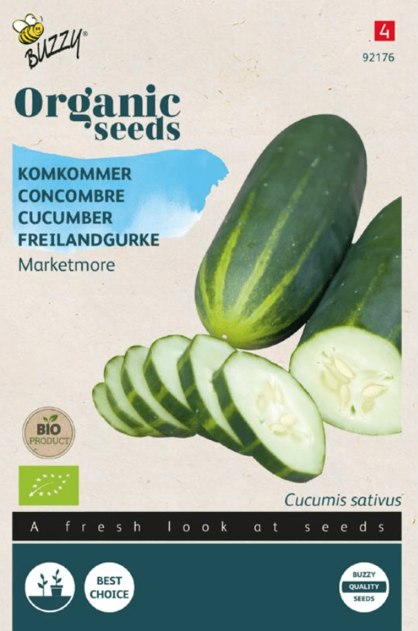 Komkommer Marketmore Bio kan je vanaf half april tot en met mei onder glas zaaien, verspenen in potjes en eind mei buiten planten. Of vanaf mei direct in de volle grond in regels zaaien. Sta tijdens de groei niet op de ranken, om bittere vruchten te voorkomen. De wetenschappelijke naam is Cucumis sativus. Er zitten ongeveer 40 zaden in 1 gram Komkommer Marketmore Bio zaad. Deze Komkommer groeit tot 2 meter hoog.
