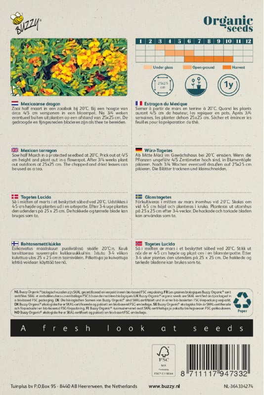 Deze Mexicaanse dragon zaden (Tagetes lucida) zaai je vanaf half maart in een zaaibak bij 20°C. Bij een hoogte van circa 4/5 cm verspenen in een bloempot. Na 3/4 weken eventueel buiten uitplanten op een afstand van 25×25 cm. De gedroogde en fijngesneden bladeren zijn als thee te bereiden.