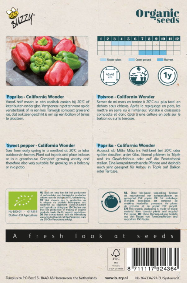 Paprika Bio Rood California Wonder kun je vanaf half maart in een zaaibak zaaien bij 20°C of later buiten onder glas. Verspenen in potten voor op de vensterbank of in een kas. Tamelijk compact groeiend ras, dat ook zeer geschikt is om op een balkon of terras te plaatsen. Er zitten ongeveer 140 zaden in 1 gram Paprika Bio Rood California Wonder zaden. De oogsttijd is van juli tot en met oktober. De plant kan wel 300 cm. hoog worden, dus zorg wel voor een goed klimrek of andere geleiding.