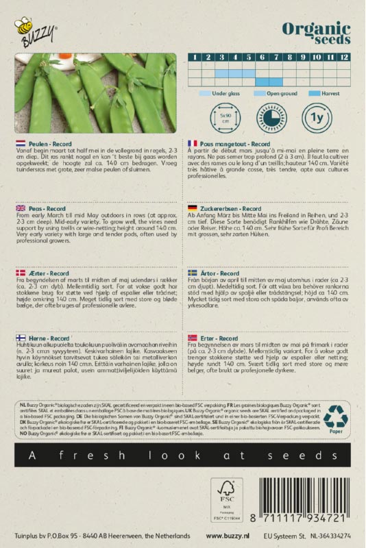 Peul Record Bio is een bron van plantaardige eiwitten, vezels en essentiële voedingsstoffen. Zeer malse peul. Biologische groentezaden. Zaaien vanaf begin maart tot half mei in de volle grond. Vroeg tuindersras met grote, zeer malse peulen.