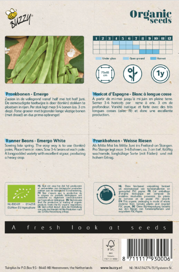 Pronkbonen Emergo Bio geeft een grote vlezig boon met een flinke opbrengst. Eet ze jong, of laat ze wat langer groeien en eet dan de (gedroogde-) peulvrucht.