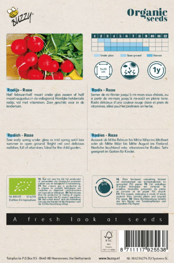 Radijs Raxe Bio kan je zaaien vanaf half februari tot en met half maart onder glas, of vanaf half maart tot half augustus in de volle grond. Heerlijke helderrode radijsjes, vol met vitaminen, dus ook zeer geschikt voor de kindertuin. De hoogte van de plant is ongeveer 15 cm. In 1 gram Radijs Raxe Bio zaden zitten ongeveer 120 zaadjes. De oogsttijd van de Radijs Raxe Bio is vanaf mei tot en met oktober.