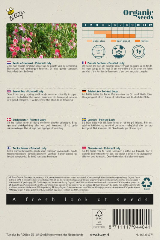 Deze reuk- of siererwt Painted Lady zaden mix (Lathyrus odoratus) zaai je vanaf half maart tot eind mei direct in de volle grond. Bemesten met gedroogde koemest of met goede compost bevordert de rijke bloei. Biologische Painted Lady siererwtzaden uit de Buzzy Organic Seeds collectie. De verpakking bevat ongeveer 2,5 gram aan zaad, zo’n 30 zaden.