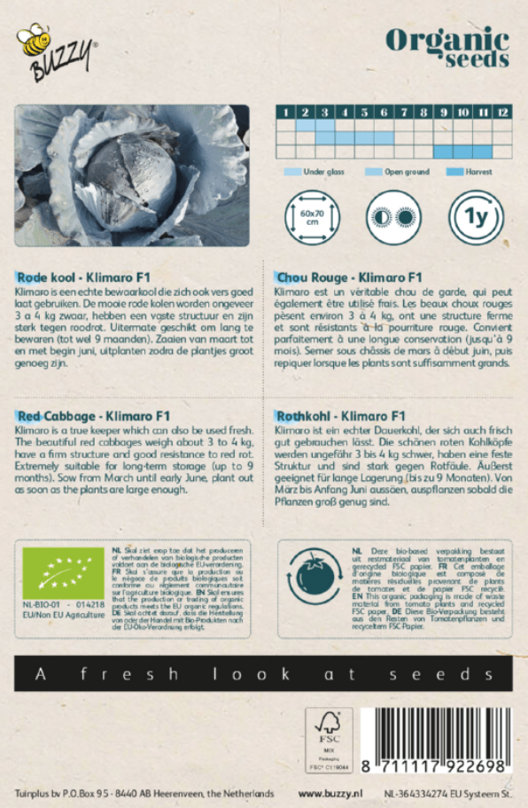 Rode kool bio Klimaro F1 is een echte bewaarkool die zich ook vers goed laat gebruiken. De mooie rode kolen worden ongeveer 3 a 4 kg zwaar, hebben een vaste structuur en zijn sterk tegen roodrot. Uitermate geschikt om lang te bewaren (tot wel 9 maanden). Zaaien van maart tot en met begin juni, uitplanten zodra de plantjes groot genoeg zijn. De wetenschappelijke naam is Brassica oleracea ‘Capitata Rubra’ De hoogte is circa 60 cm. Oogsten vanaf september.