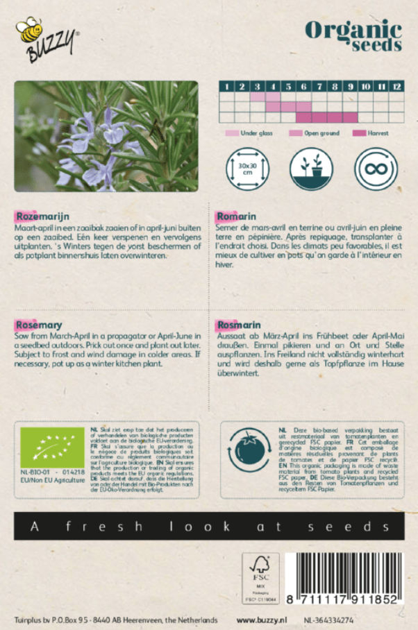 Rozemarijn bio kan je vanaf  maart-april in een zaaibak zaaien of in april-juni buiten op een zaaibed. Eén keer verspenen en vervolgens uitplanten. ‘s Winters tegen de vorst beschermen of als potplant binnenshuis laten overwinteren. In de tuin kan deze plant ook prima groeien en bloeien. Rozemarijn Bio heeft een voorkeur voor een droge, warme plek in de tuin. Ook de bloei van Rozemarijn Bio is zeer fraai. In 1 gram Rozemarijn Bio zaadjes zitten ongeveer 800 zaden.