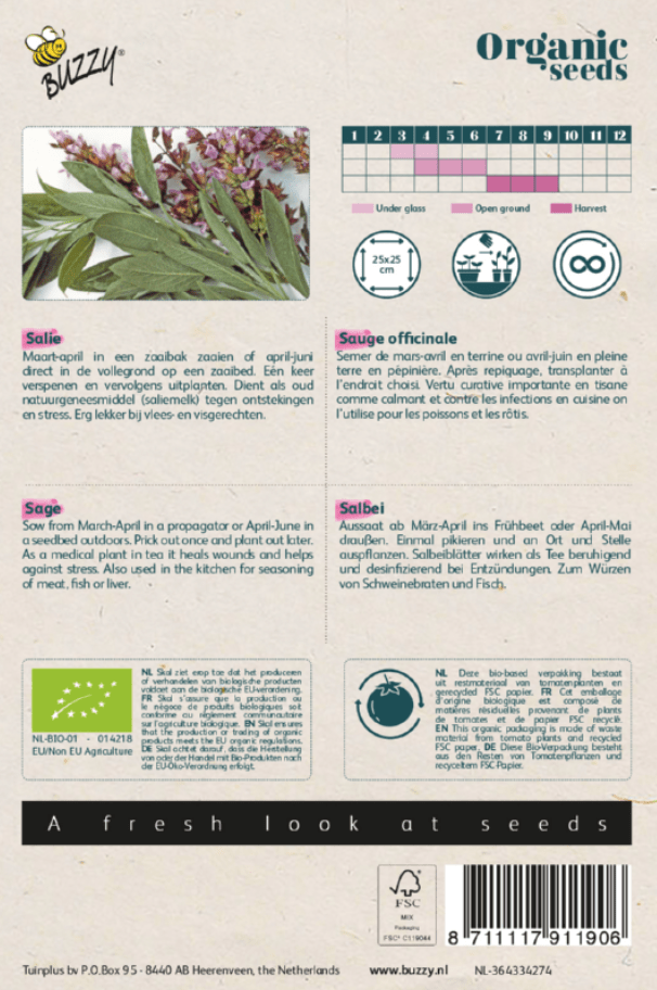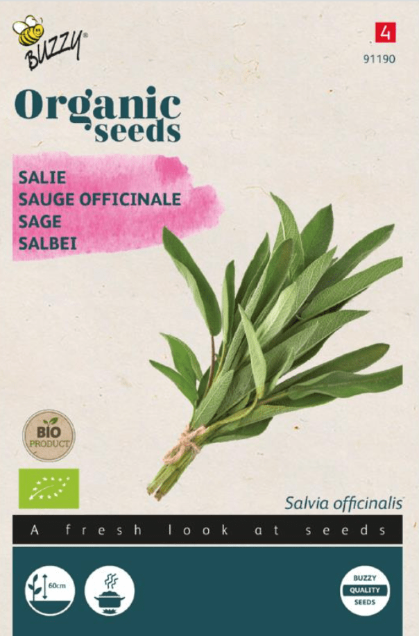 Salie bio zaai je vanaf maart-april in een zaaibak of april-juni direct in de volle grond op een zaaibed. Eén keer verspenen en vervolgens uitplanten. Dient als oud natuurgeneesmiddel (saliemelk) tegen ontstekingen en stress. Erg lekker bij vlees- en visgerechten. De hoogte van de plant is ongeveer 60 cm. In 1 gram zaden zitten ongeveer 130 stuks Salie Bio zaden. De jonge takjes met de kleine blaadjes oogsten.