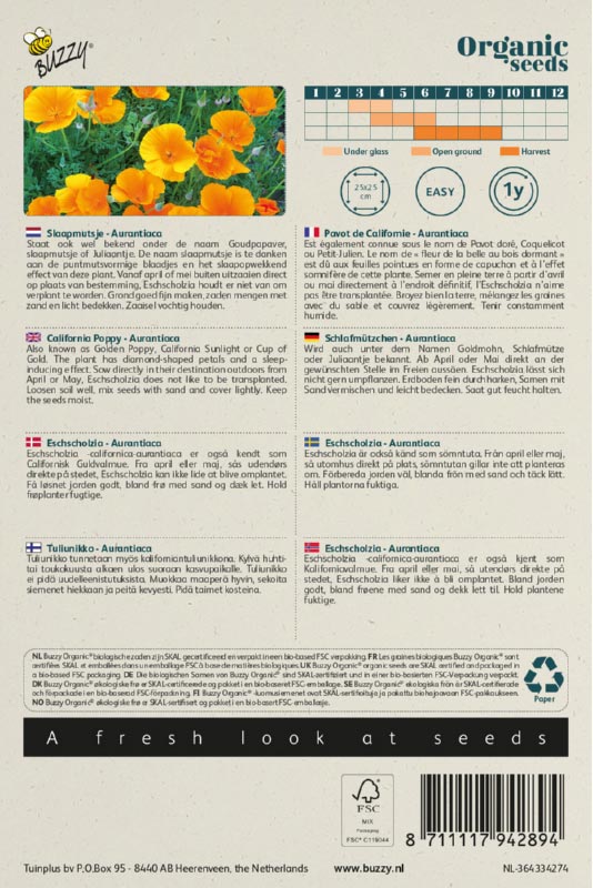 Slaapmutsje zaden zaai je vanaf april of mei. ’s Nachts of bij koud of winderig weer sluiten de bloembladen, wat de bloem haar Nederlandse naam opleverde. Er bestaan ook plantaardige slaapmiddelen, waarin Slaapmutsje een van de bestanddelen vormt. Eén zakje Slaapmutsje zaden uit de Buzzy Organic Seeds collectie bevat ongeveer 325 zaden. De plant is goed bruikbaar als tuinplant en als snijbloem.