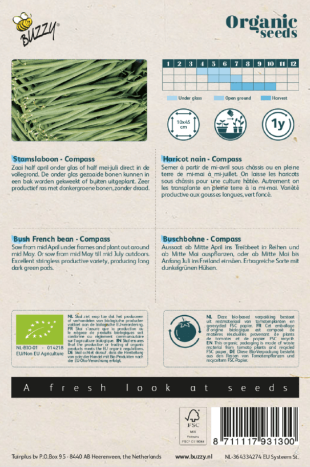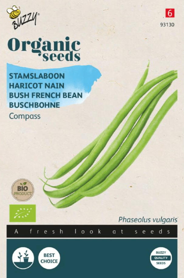 Stamslaboon Compass Bio zaai je vanaf half april onder glas of half mei tot en met juli direct in de volle grond. De onder glas gezaaide bonen kunnen in een bak worden gekweekt of buiten uitgeplant. Zeer productief ras met donkergroene bonen, zonder draad. De hoogte van de plant is ongeveer 40 cm. De oogsttijd van de Stamslaboon Compass Bio begint in juli en loopt tot en met oktober. Er zitten ongeveer 10 zaden in 1 gram zaden van de Stamslaboon Compass Bio.