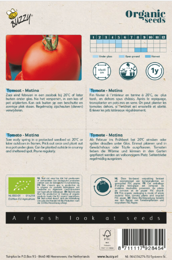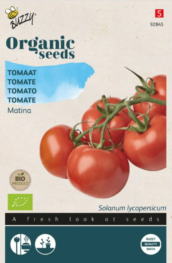 Tomaat Matina Bio zaai je vanaf eind februari in een zaaibak bij 20°C of later buiten onder glas. Na het verspenen, in een kas of pot uitplanten. Kan ook buiten op een beschutte en zonnige plek staan. Regelmatig zijscheuten verwijderen. De plant wordt ongeveer 150 cm. Er zitten ongeveer 400 zaden in 1 gram zaden van de Tomaat Matina Bio. De oogsttijd is van augustus tot en met september.