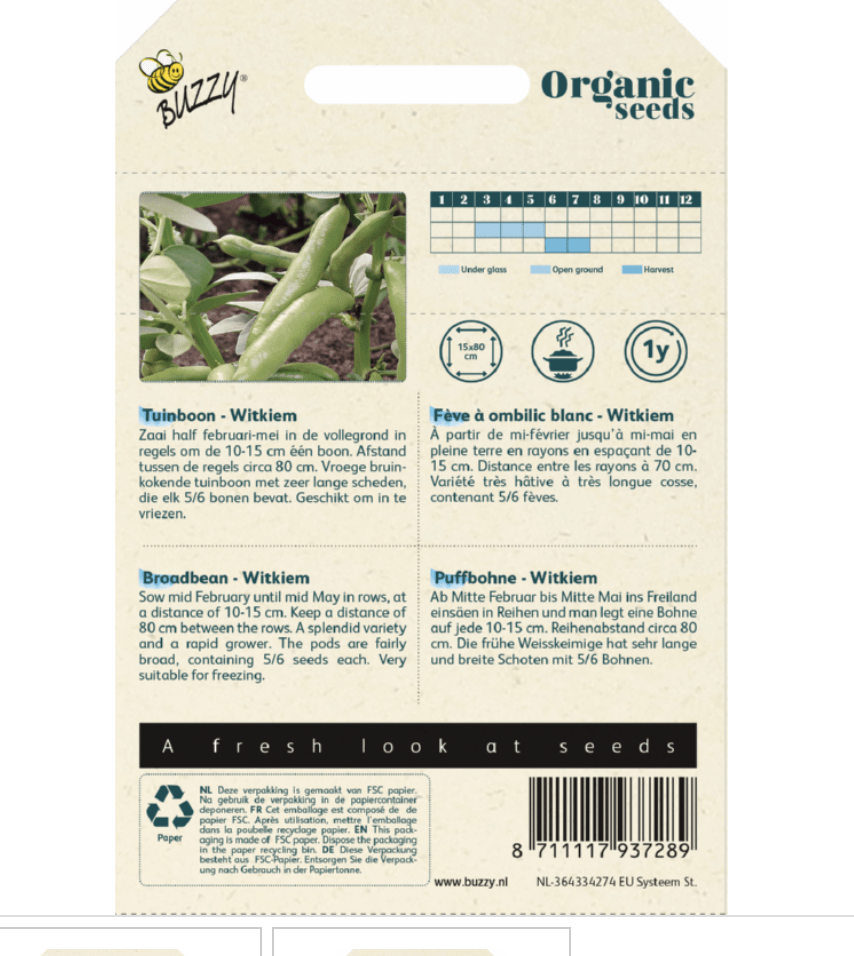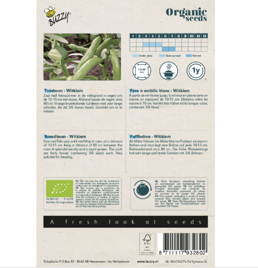 Deze biologische zaden Tuinboon Bio Witkiem kunt u zaaien vanaf half februari tot half mei in de vollegrond in regels, om de 10-15 cm, één boon.