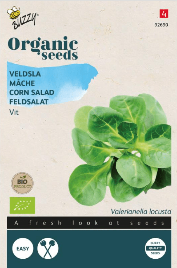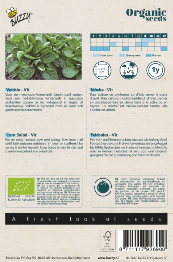 Veldsla Vit Bio, ofwel Grote Noordhollandse Veldsla kan je voor een voorjaars-/zomerteelt begin april zaaien. Voor een herfst-/vroege winterteelt in augustus-september zaaien in de volle grond in regels of breedwerpig. Veldsla is bijzonder mals en leent zich goed voor saladeschotels. De plantjes worden ongeveer 10 cm. hoog.