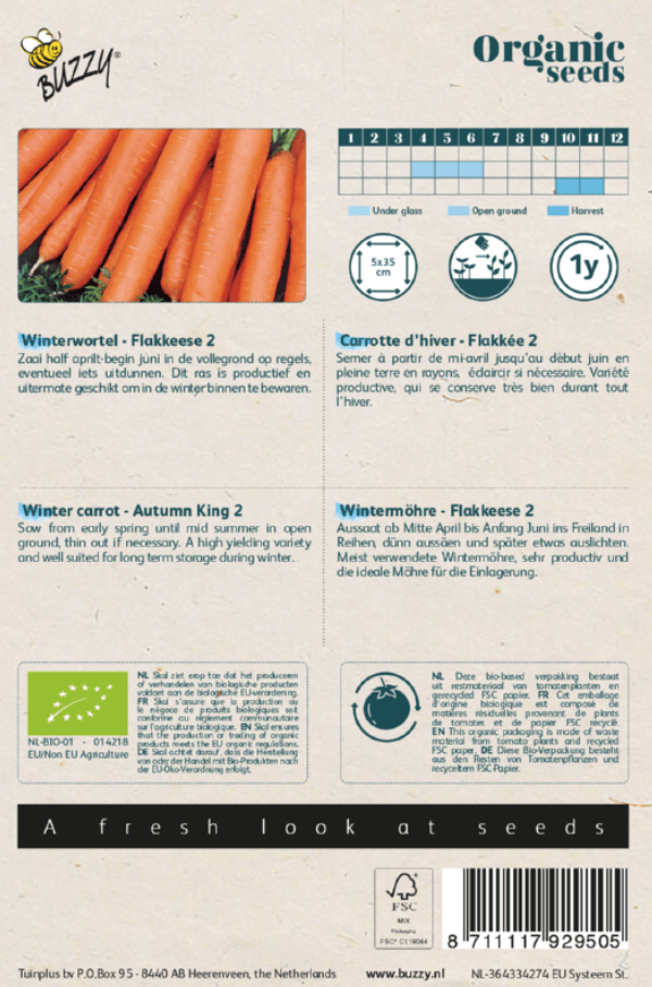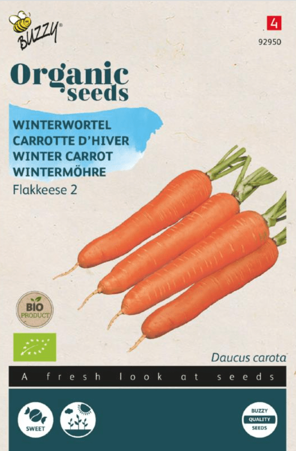 Winterwortel Flakkeese 2 Bio zaai je vanaf half maart tot en met begin juni in de volle grond op regels, eventueel iets uitdunnen. Dit ras is productief en uitermate geschikt om in de winter binnen te bewaren. De plant wordt ongeveer 40 cm. hoog. Het loof is ook prima te eten. De oogsttijd is van oktober tot en met november. De grond moet lekker vochtig zijn. Deze zaden hebben een prima opbrengst. 1 gram zaden van de Winterwortel Flakkese 2 Bio bevat ongeveer 1000 zaden.