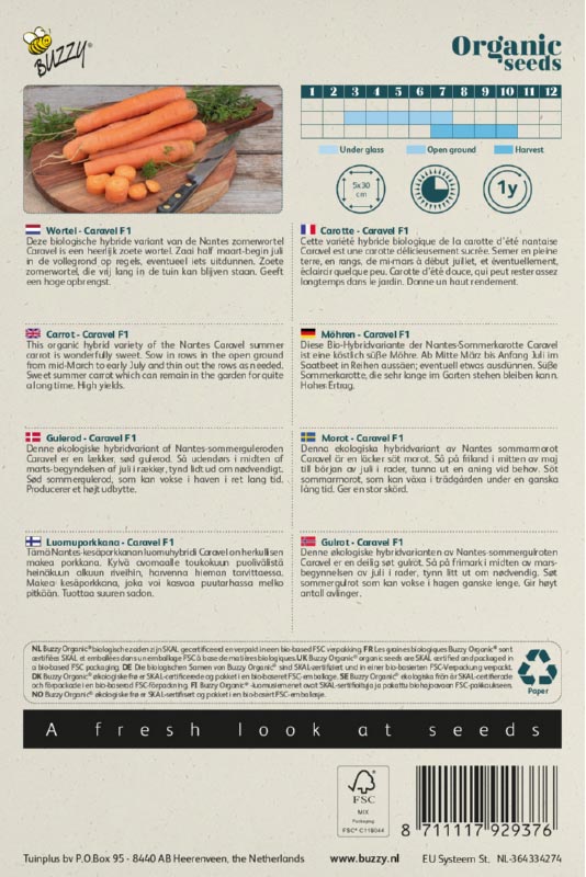 Wortel Caravel F1 is een biologische hybride variant van de Nantes zomerwortel. Caravel is een heerlijk zoete wortel. Zaai half maart-begin juli in de volle grond op regels, eventueel iets uitdunnen. Je kunt deze zoete zomerwortel vrij lang in de tuin laten staan. Geeft een hoge opbrengst aan wortels.